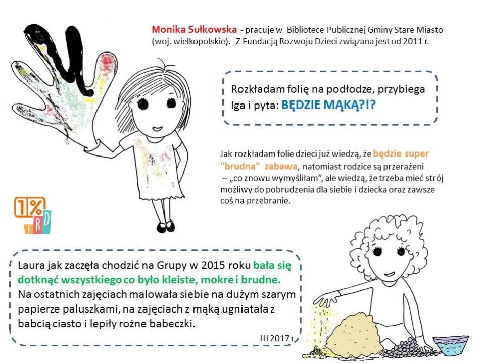 Rozkładam folię na podłodze, przybiega Iga i pyta: BĘDZIE MĄKĄ?!? MONIKA SUŁKOWSKA – pracuje w Bibliotece Publicznej Gminy Stare Miasto (woj. Wielkopolskie). Dzięki współpracy z Fundacją Rozwoju Dzieci od dwóch lat prowadzę w bibliotece Grupę Zabawową dla dzieci od półtora roku do 3 lat i ich rodziców. Bardzo dużo dało…...